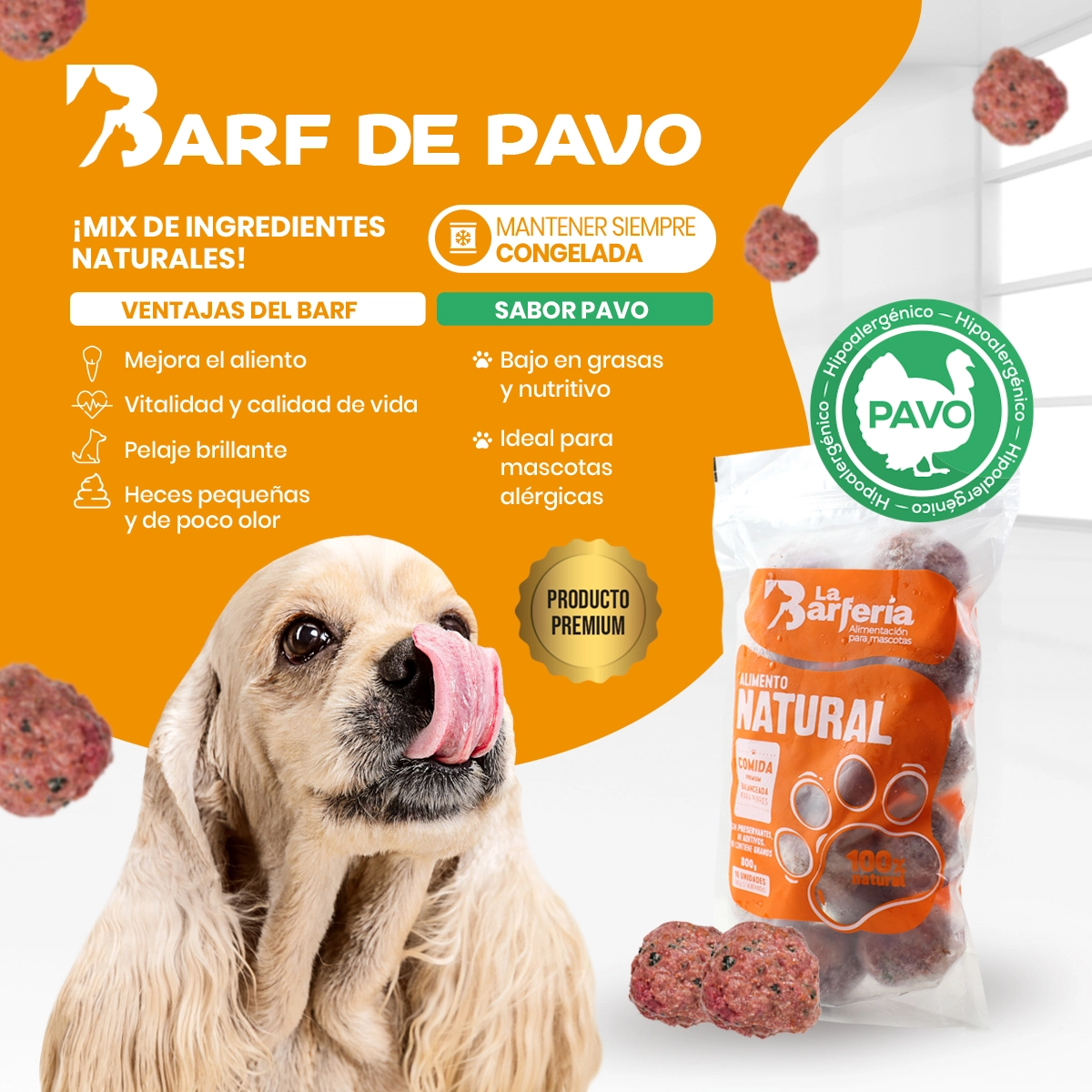¡Una opción suave y saludable, además de ser baja en grasas! Ideal para perros sensibles o alérgicos. Cada bolsa de 800 g contiene 16 albóndigas de 50 g, elaboradas con carne de pavo, huesos carnosos de pavo, vegetales y frutas, avena y el delicioso aporte del camote.
